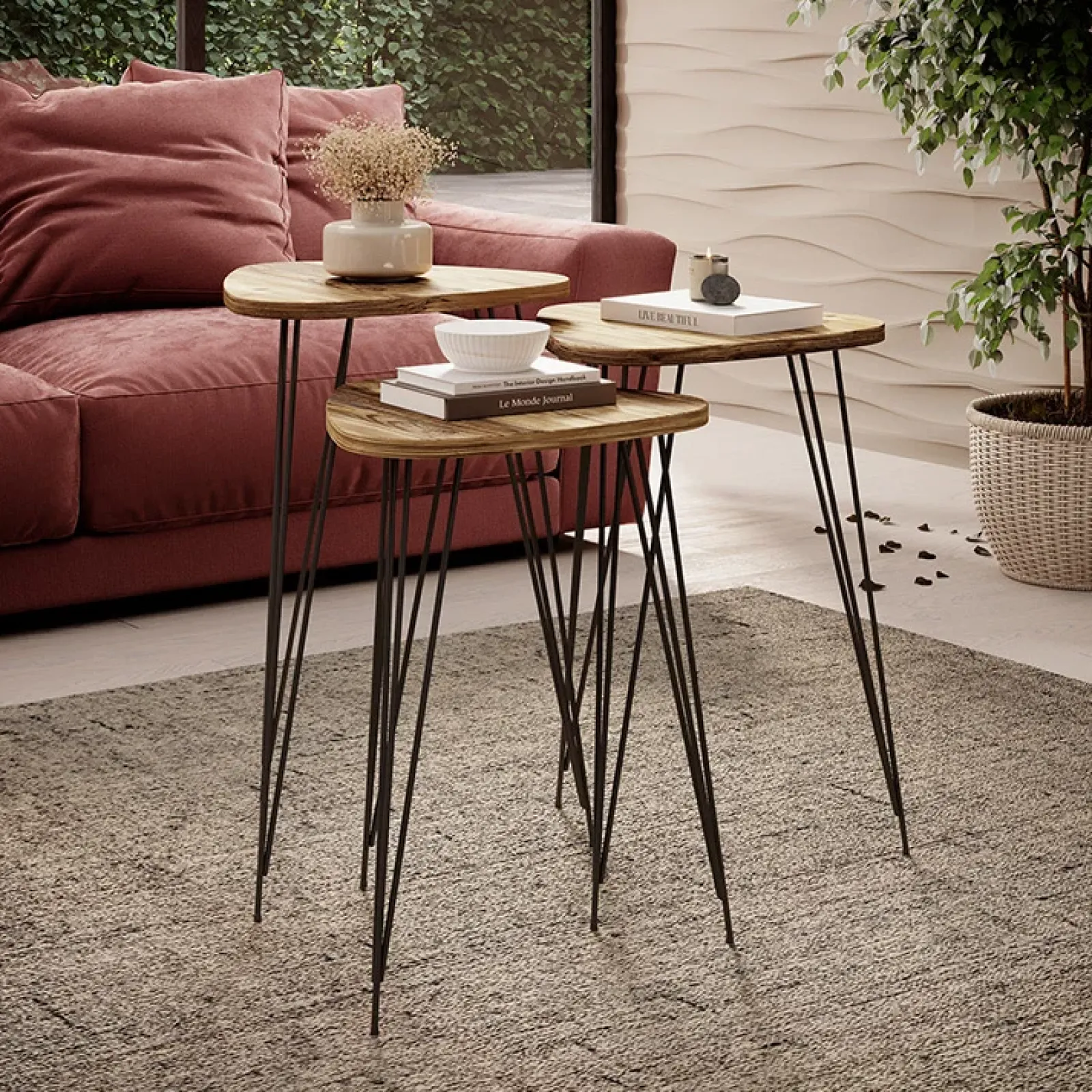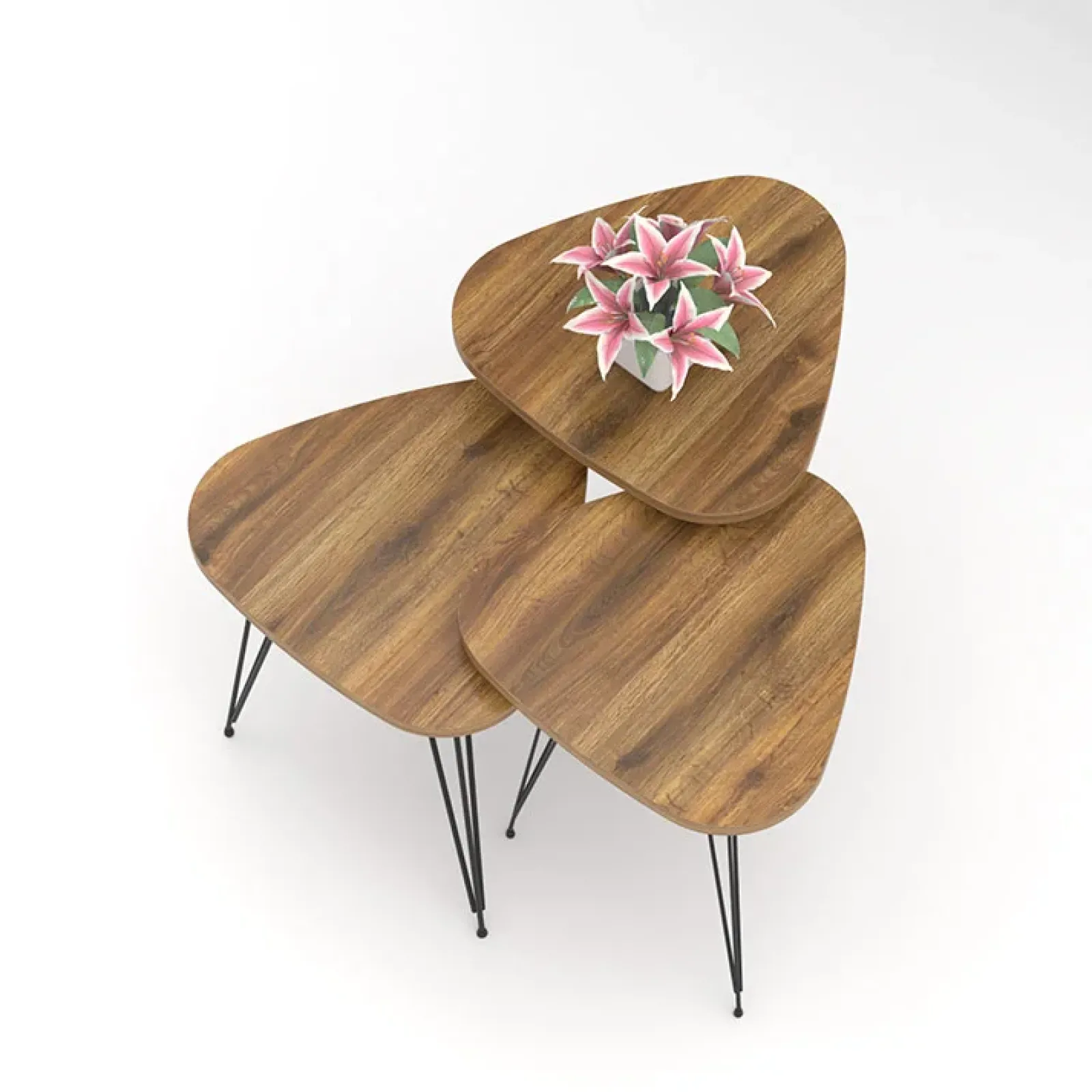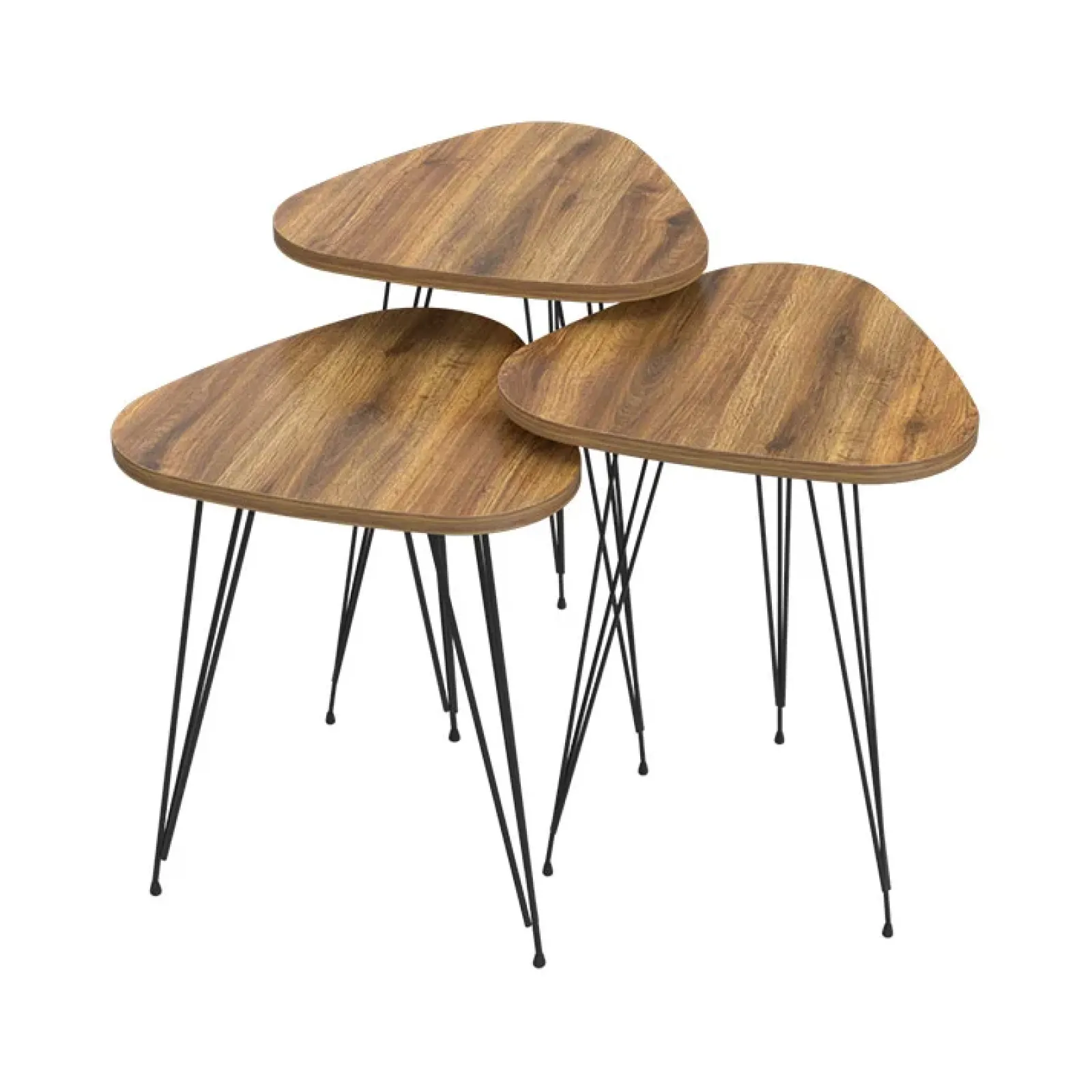 Realizzate in metallo verniciato di nero, resistenti e antigraffio, si tratta di un set di tavolini con differenti altezze. La composizione è piuttosto originale e dona un tocco di classe al tuo soggiorno o studio. Il piano d’appoggio realizzato in rovere chiaro presenta una forma affusolata, diversa dalle più tradizionali forme arrotondate.