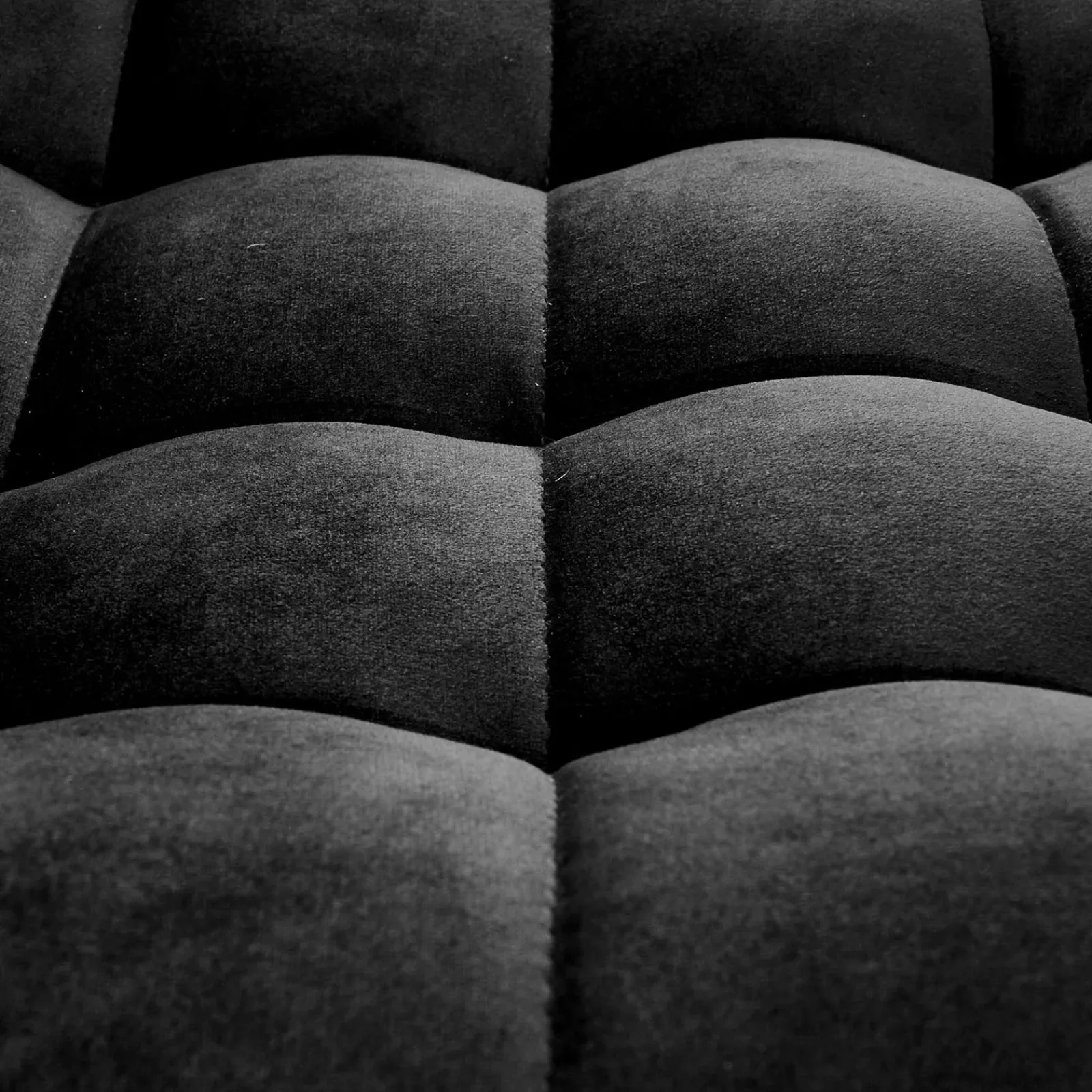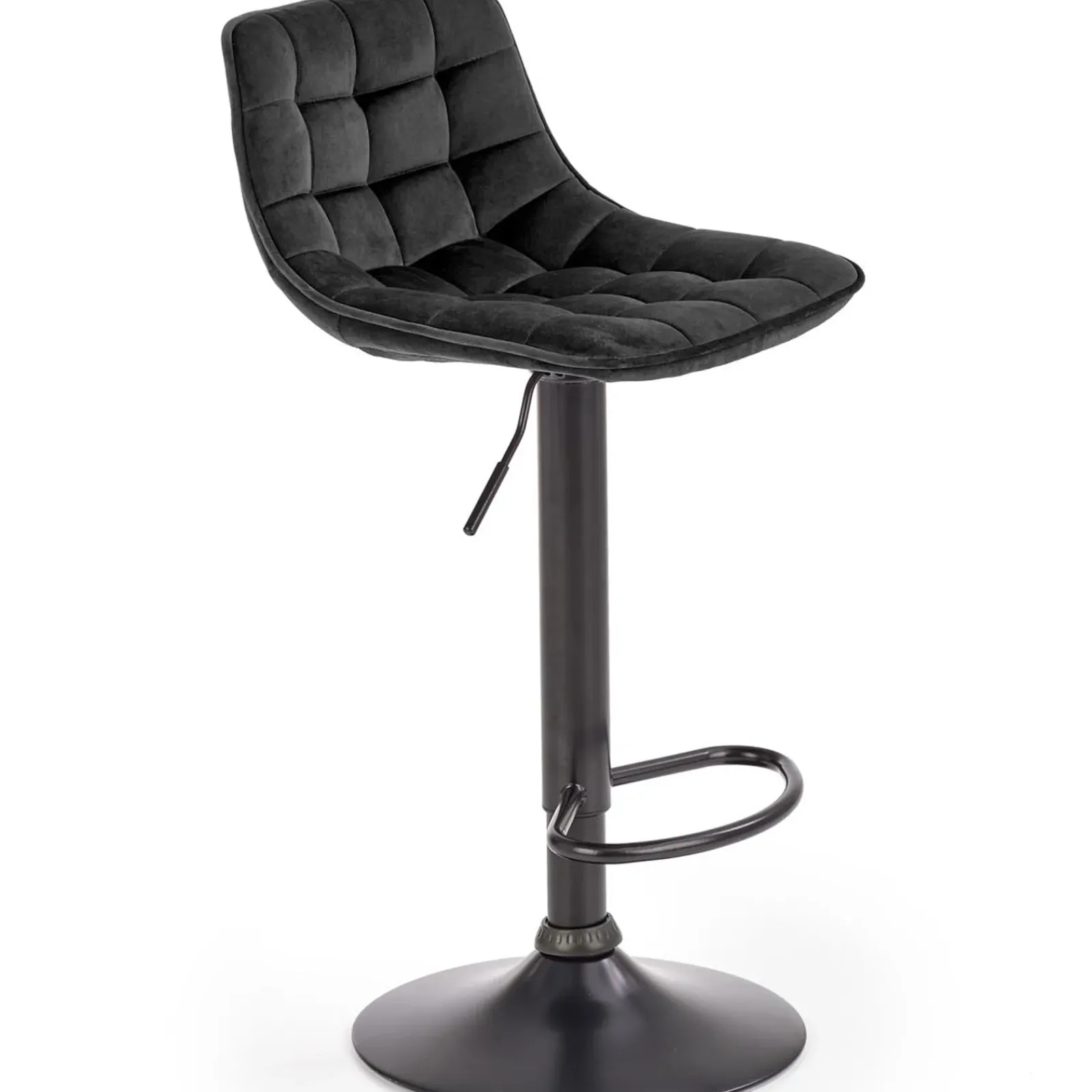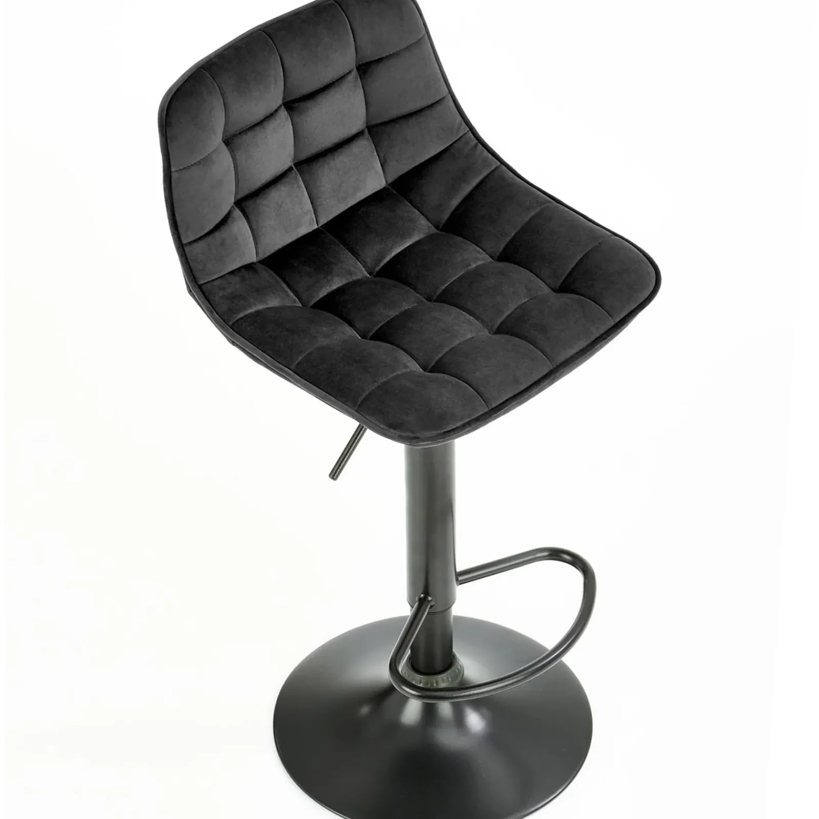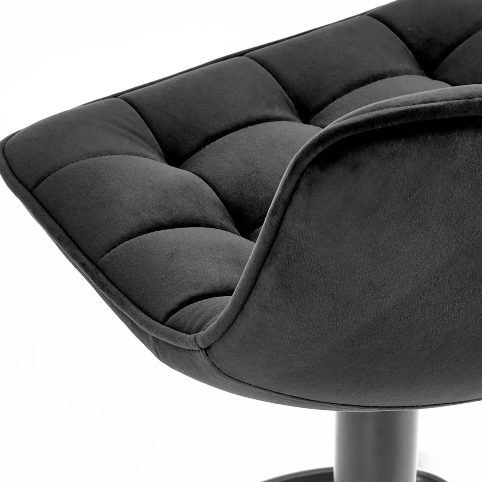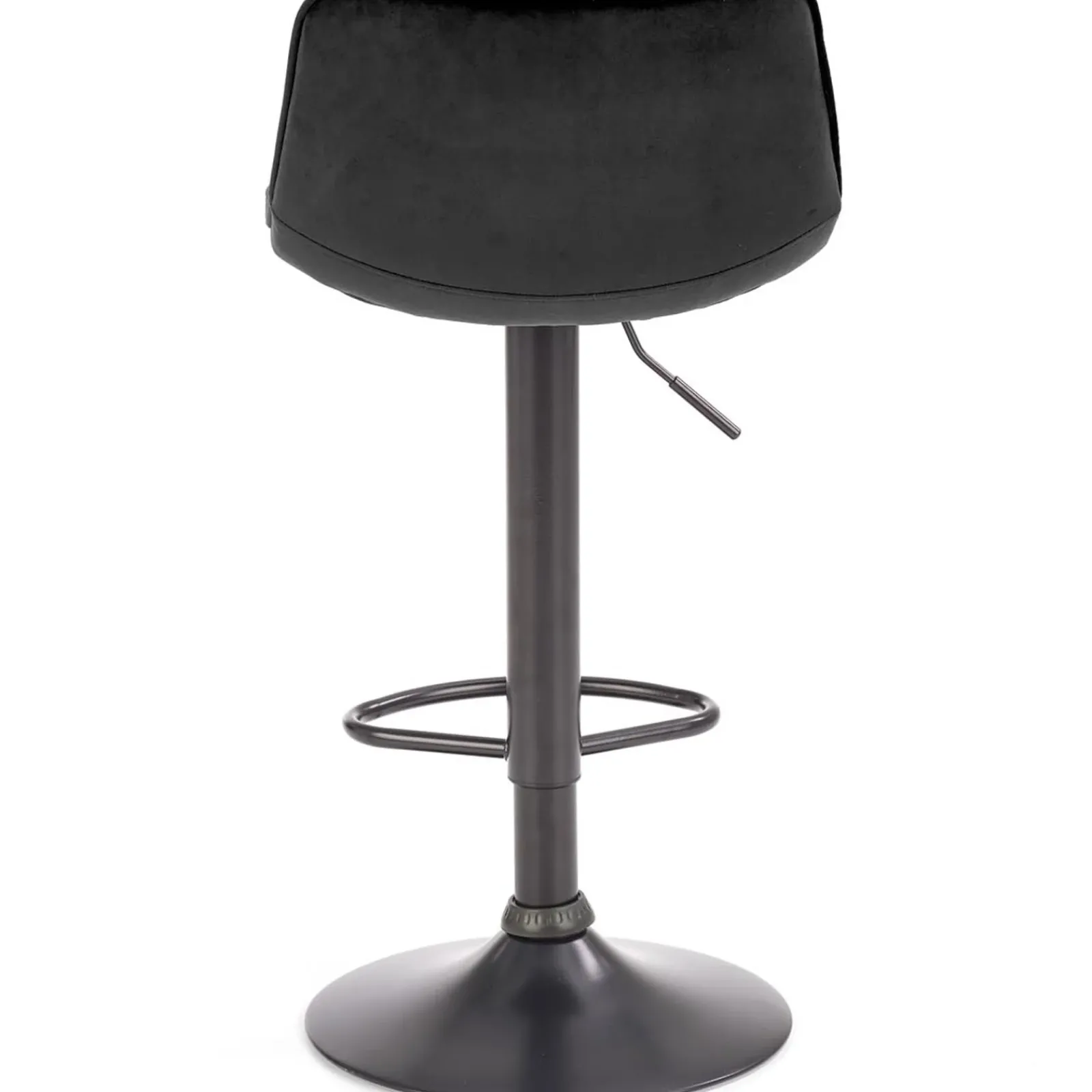 La seduta imbottita e trapuntata, rivestita in un pregiato velluto nero, dona un tocco caldo e sofisticato, rendendo lo sgabello non solo bello da vedere ma anche estremamente comodo. La struttura in acciaio nero, solida e resistente, è dotata di un pratico poggiapiedi integrato per un comfort maggiore.