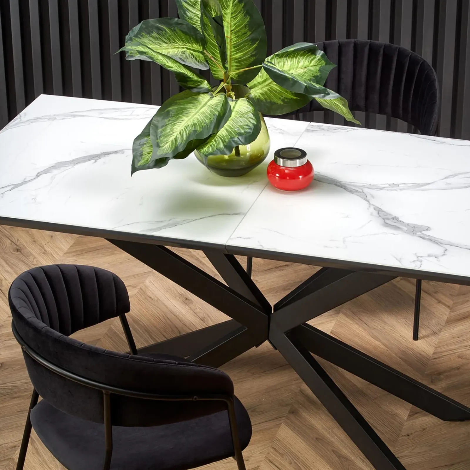Con le sue finiture ricercate e il gioco di contrasti tra bianco marmorizzato e nero, Lennox diventa il protagonista della zona pranzo, ideale per chi cerca un tavolo che unisca estetica, versatilità e presenza scenica.
