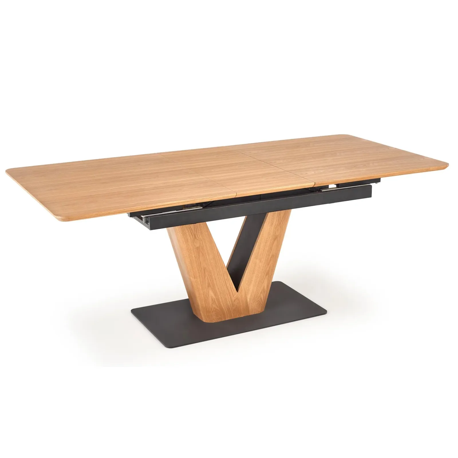 Il vero tratto distintivo è la sua struttura: una gamba centrale a forma di “V”, decisa e dinamica, che poggia su una solida base nera. I dettagli in acciaio nero, resistenti e dal look industriale, contrastano con la calda tonalità del piano, creando un mix equilibrato tra forza visiva e raffinatezza.