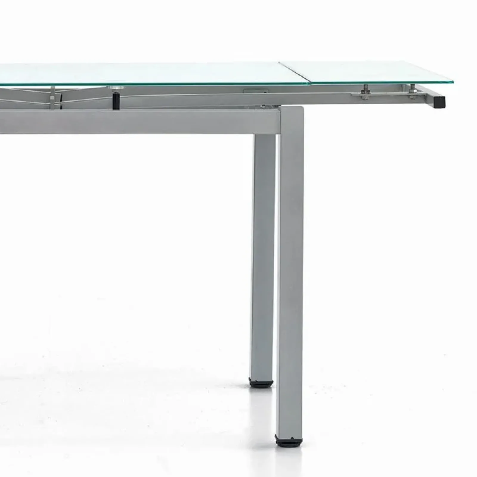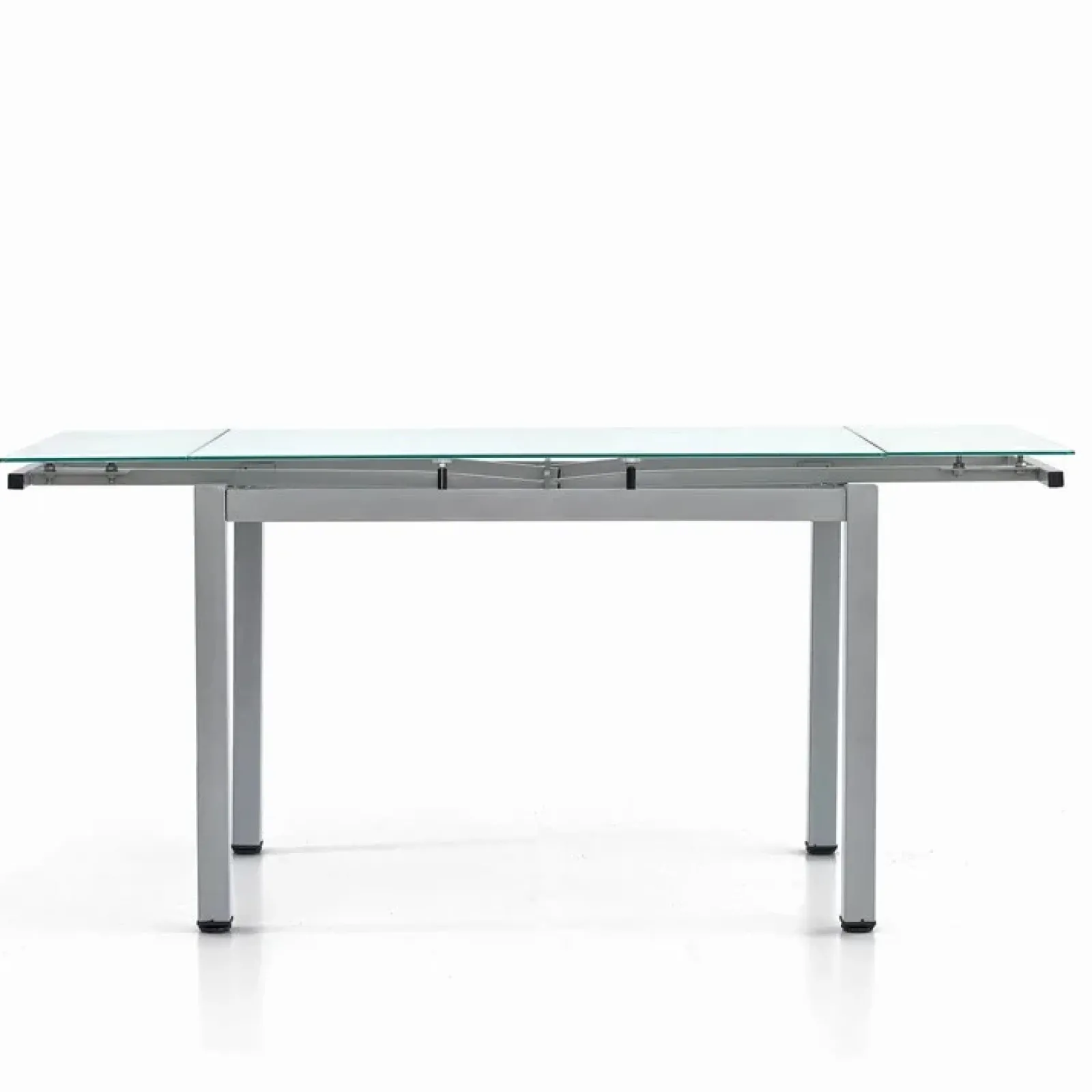 Si tratta di una proposta contemporanea, composta da un piano in vetro acidato satinato e da una struttura in metallo. É il complemento perfetto per ottimizzare lo spazio: da chiuso ha un ingombro davvero minimo, mentre da aperto, grazie a 2 allunghe di 30 cm ciascuna, diventa un comodo tavolo di 170 cm. Le allunghe sono riposte direttamente sotto il piano del tavolo e si estraggono lateralmente a scorrimento.