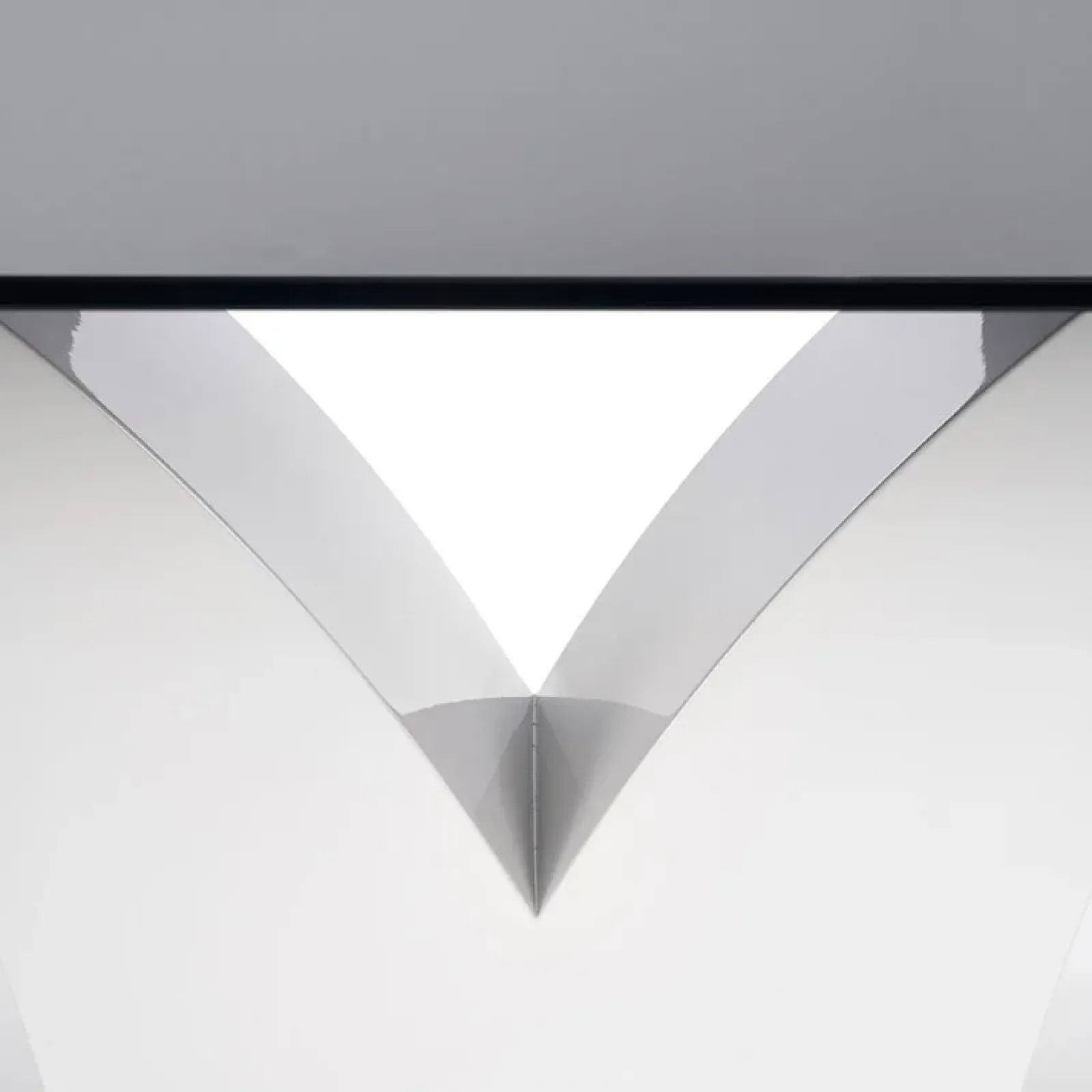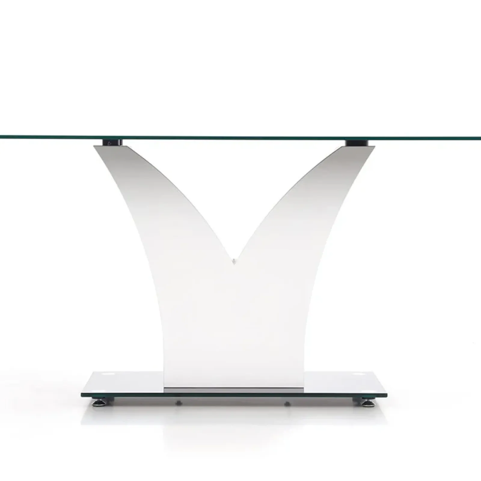 Il suo punto di forza è senza dubbio la struttura portante, la quale si configura come una “V” molto aggraziata in MDF laccato bianco opaco, la quale va a sostenere il piano d’appoggio, realizzato in vetro nero.
