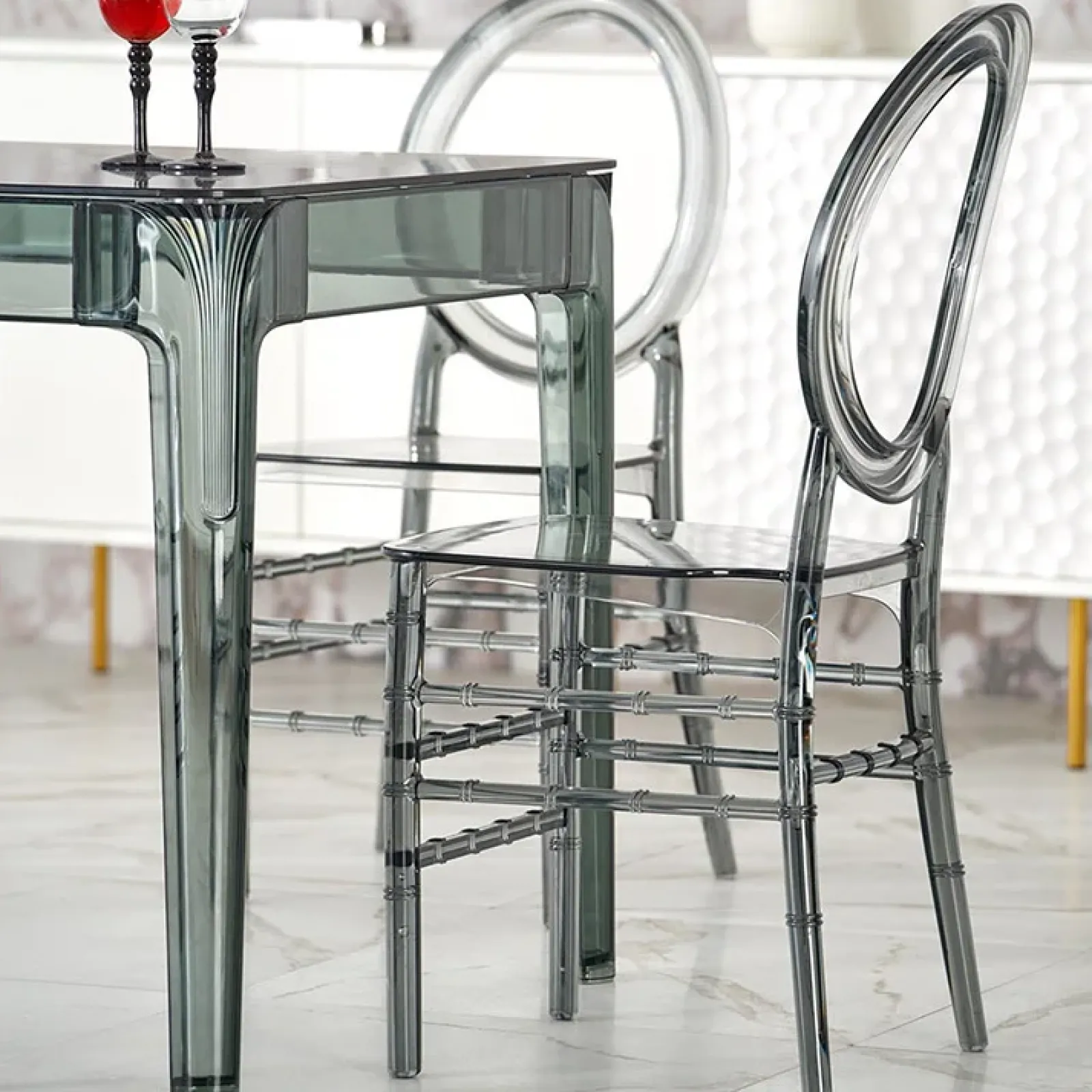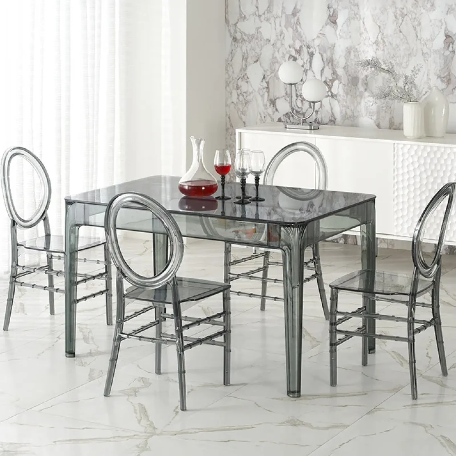 Se stai cercando un tavolo moderno ed elegante che si distingua nei tuoi interni, il tavolo Naked trasparente, realizzato in vetro fumè e polipropilene, è un’ottima scelta.