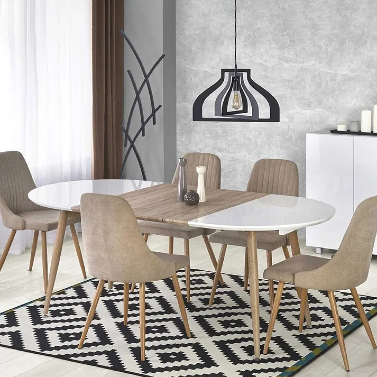 Il tavolo rotondo Papiro Gihome®, in finitura bianco lucido e rovere sanremo, è perfetto per ambienti moderni ed è ideale per arredare in stile nordico la propria casa. Infatti, il colore che fra tutti salta alla mente quando si parla di mood scandinavo è sicuramente il bianco, spesso abbinato a un legno chiaro, come nel caso di questo tavolo. Per rispettare appieno lo stile, prevedi pareti rigorosamente bianche che vanno a sposarsi con il legno chiaro del pavimento (o un gres effetto legno naturale) e dei complementi d’arredo. Questa è la base neutra da cui partire per poi andare a regalare all’ambiente piccoli accenti di colore, giocando con i tessuti e gli accessori: beige, tortora, grigio, crema ti aiuteranno a rendere più calda la stanza!